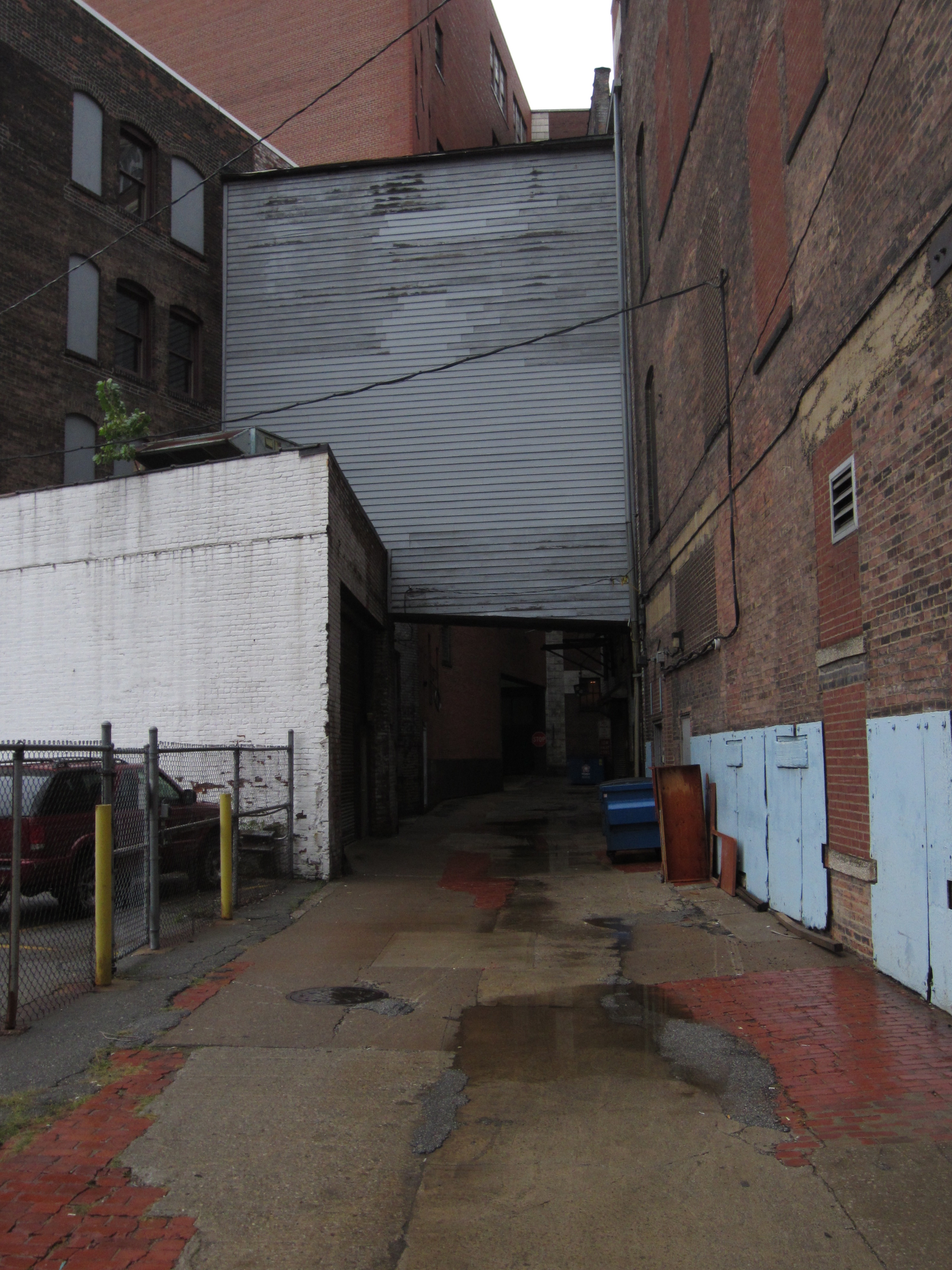 Brownell Court leads into Swingos Court, eastward, running parallel to Euclid Avenue. As one walks down Brownell to East 13th Street, the red brick substrate begins to show itself. The landscape becomes more dense. Many bridges connect buildings over alleys. The red brick begins to stand out among the muted greys and browns typically found at the rear of aging structures. As I found out later, bright red brick is a constant in Cleveland. This was a surprise to me, considering the materials found in Cincinnati’s alleys range from dark red and brown bricks to white Belgian Block to cobblestone and more.
