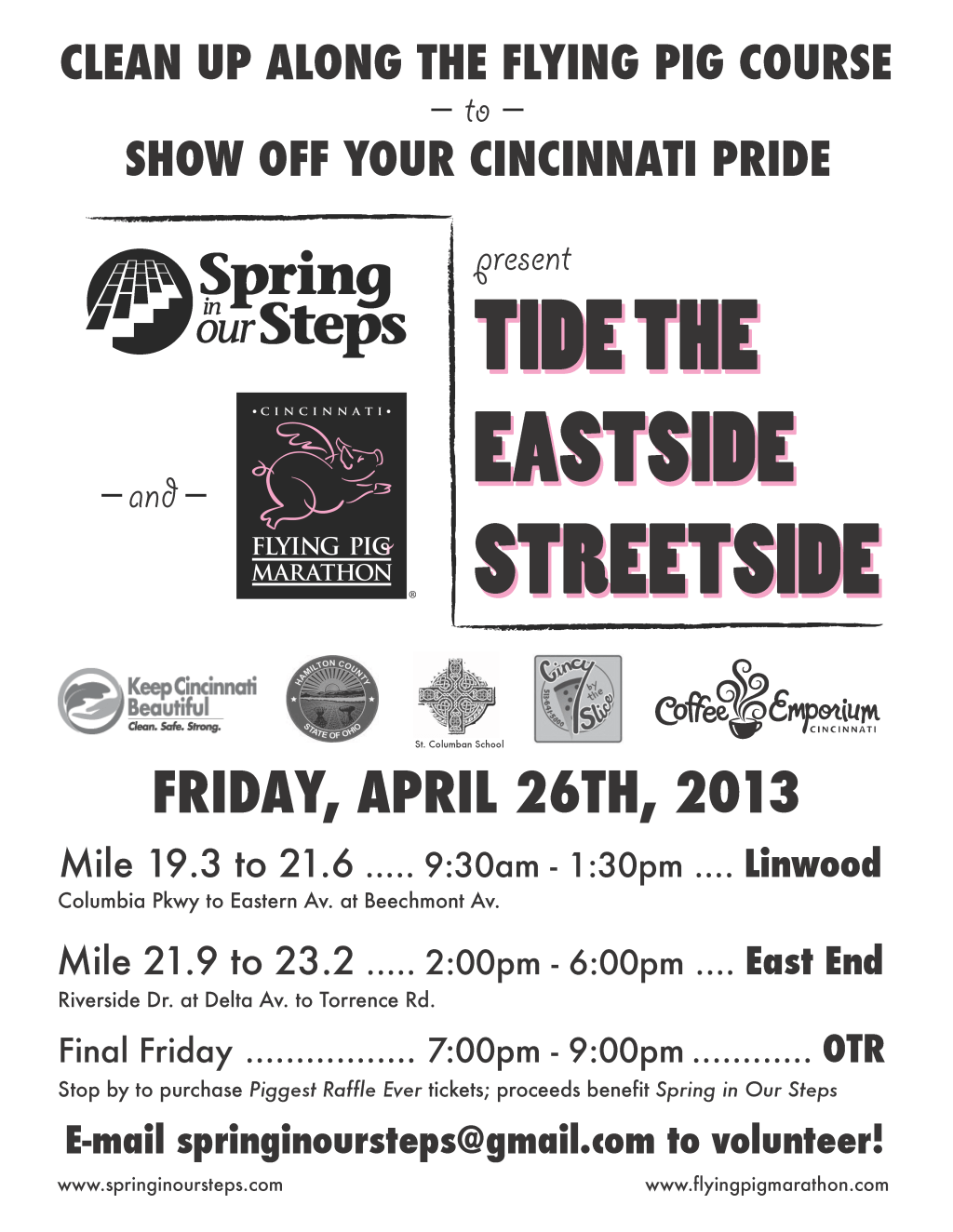 This Friday’s cleanup event in Linwood and East End will serve as a collaboration between the Flying Pig Marathon and Spring in Our Steps (SiOS), and act as a fundraiser for SiOS. Spring in Our Steps will be advising the entire event. Tools will be provided by Keep Cincinnati Beautiful, and we will have use of the Pigmobile to transport tools.