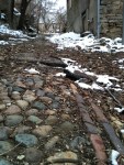 Since March 24, 2012, Spring in Our Steps had developed a particular affinity for Peete Alley, a curved, cobblestone public space between the western end of Peete Street and the 2200 block of Vine Street in Over-the-Rhine. And we’re not talking about the common misinterpretation of a cobblestone surface. Peete Alley is one of only five known examples of exposed, rounded, irregularly-shaped river stones left in Cincinnati. [The others are a one-block segment of Bright Alley in the West End, part of Corn Alley in the West End, a portion of a one-block segment of Kirk Alley in Clifton Heights, and Nagel Alley near Mohawk Place in Over-the-Rhine.]