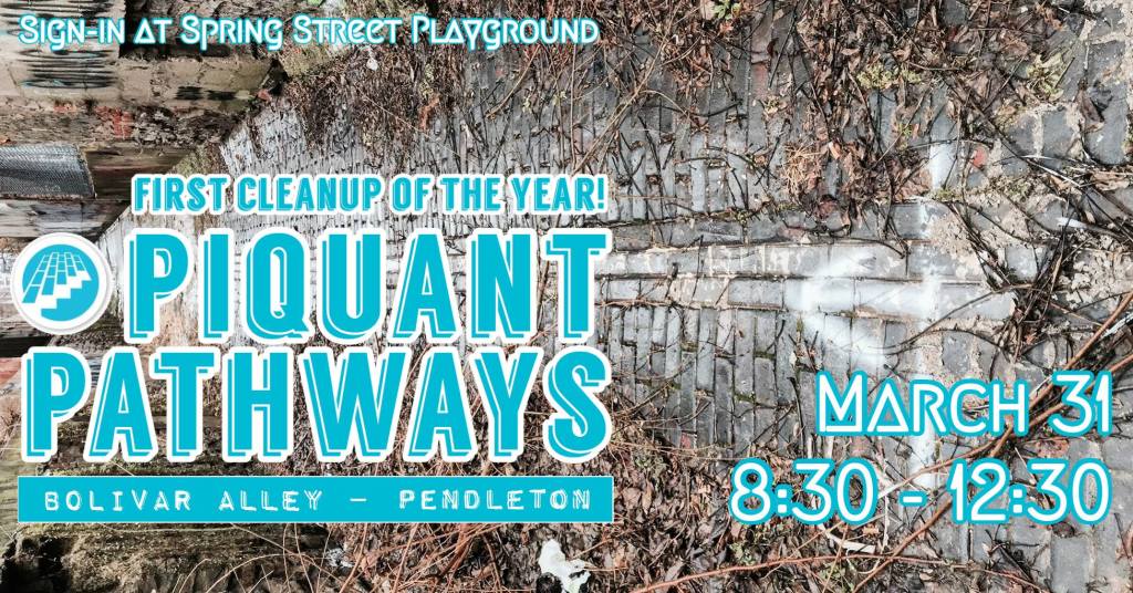 Hello supporters! We’re kicking off our 2018 activities in traditional fashion, with an alley cleanup! We’re thrilled about an exciting collaboration with several respected community partners. AGAR, a social intelligence agency that “leverages human experiences, event production, digital platforms, music, art and content design to grow culture” was a major player in the production of BLINK Cincincinnati. ArtWorks Cincinnati. Together, we’re bringing a renewed presence to a network of alleys in the Pendleton neighborhood. To start, Spring in Our Steps will proudly start cleanup of Bolivar Alley, located between Pendleton Street & Reading Road!