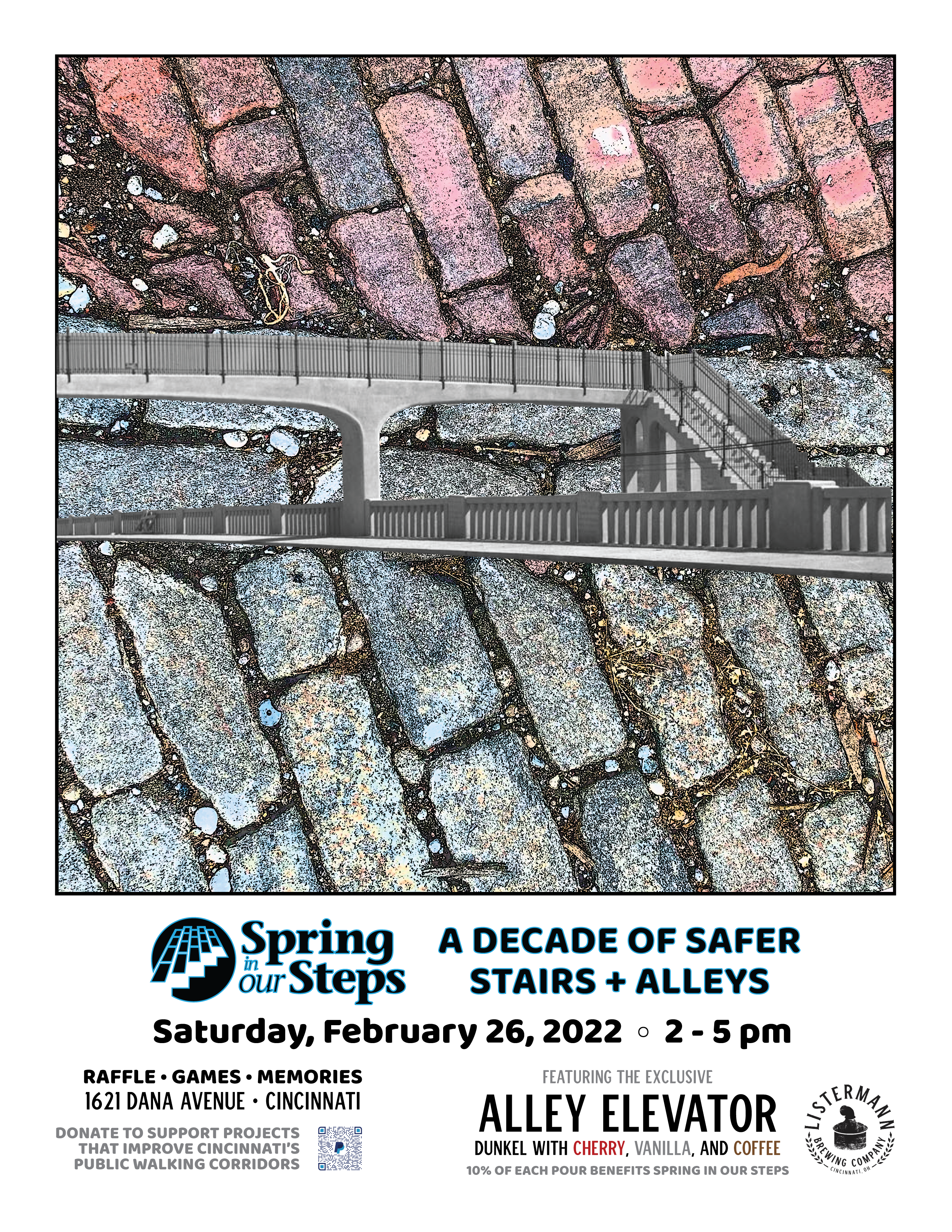 We would love it if you can join us to celebrate A Decade of Safer Stairs + Alleys – Saturday, February 26, 2022 from 2pm to 5pm – at Listermann Brewing Company (1621 Dana Ave)!!!