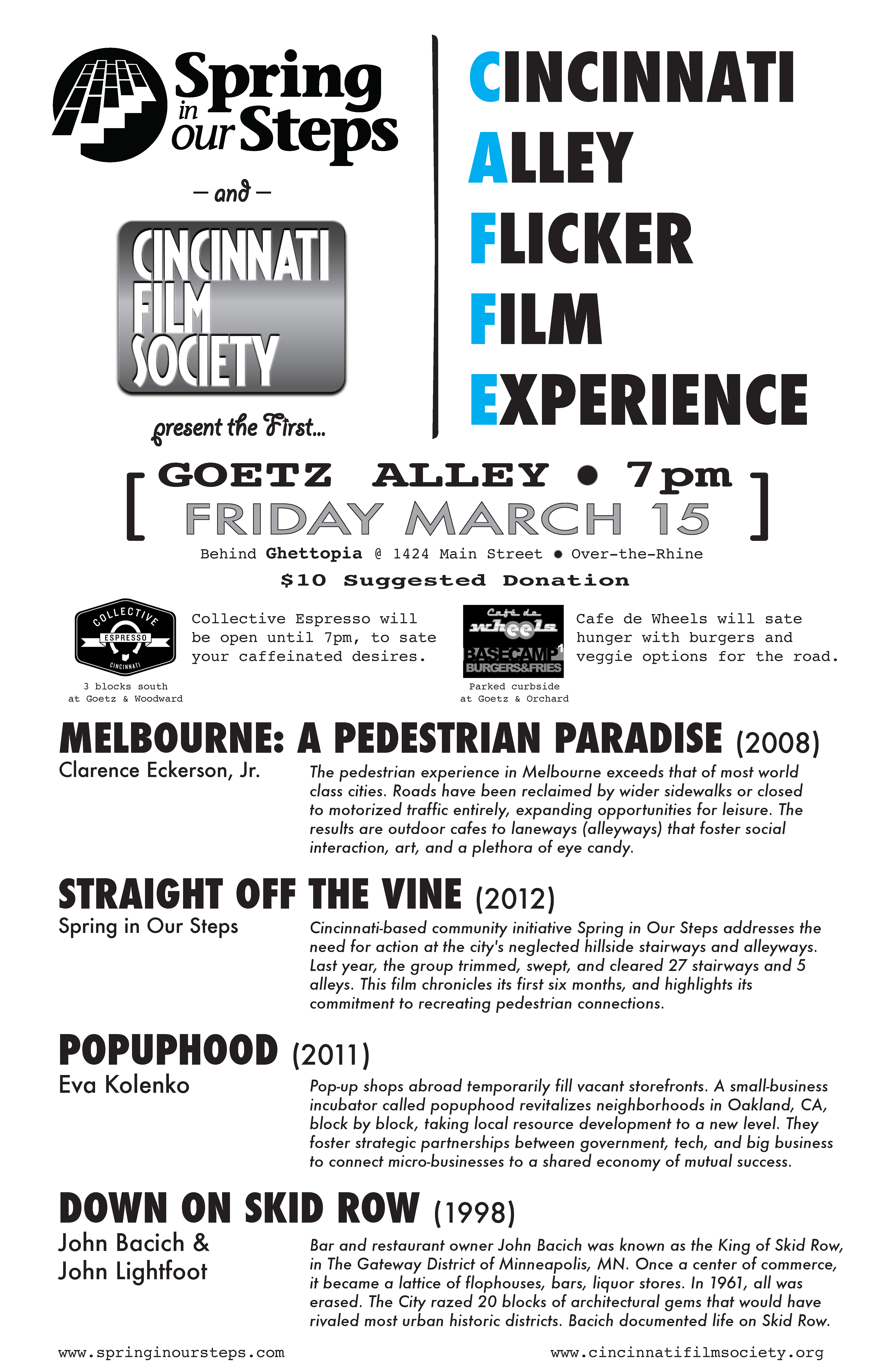Spring in Our Steps piggybacked on a wonderful tradition from eco-hostel Ghettopia Bunk Haus to begin hosting film screenings that exhibit work happening in cities around the world. We call it a “flicker” as a way to signify a film showing in an unconventional setting, in a flash. The next morning, you wouldn’t even know that great times were had, but you’ll notice a change in the appearance of the alley itself! We are pleased to present these events throughout Cincinnati in an effort to diversify the methods through which we celebrate the less appreciated pedestrian space in Cincinnati! They are meant, simply, to be community gatherings in less conventional public space for neighborhood joy.