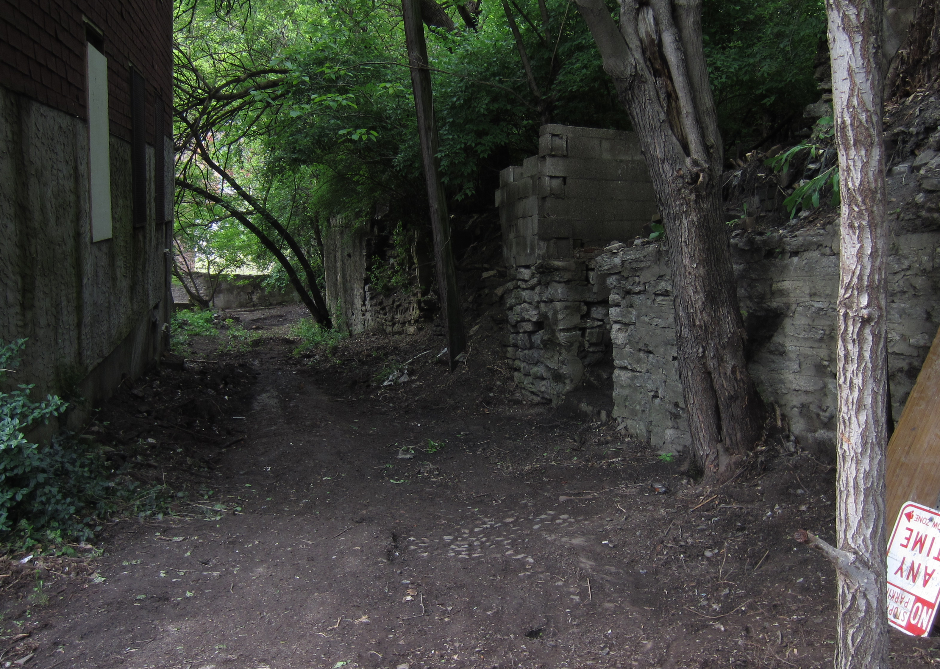 Peete Alley is one of two spurs of Peete Street, the Over-the-Rhine neighborhood of Cincinnati. A cobblestone paved connection between Peete Street and Vine Street, Peete Alley is lined with overgrown, vacant lots on Mulberry Street, while vacant buildings abut it on the other side from Vine Street. Only seven structures remain on Peete Street, between the alley and Frintz Street to the southeast.