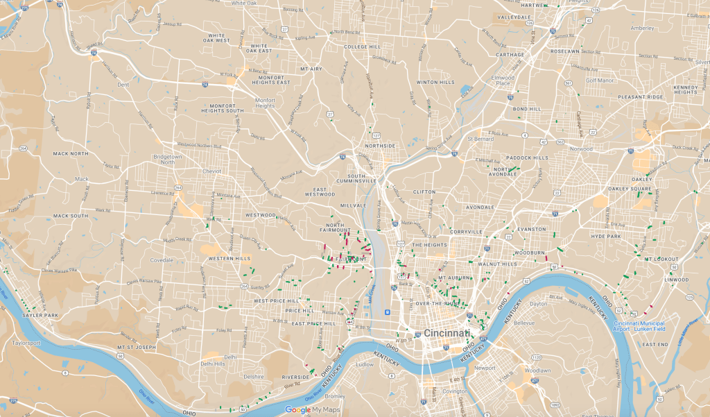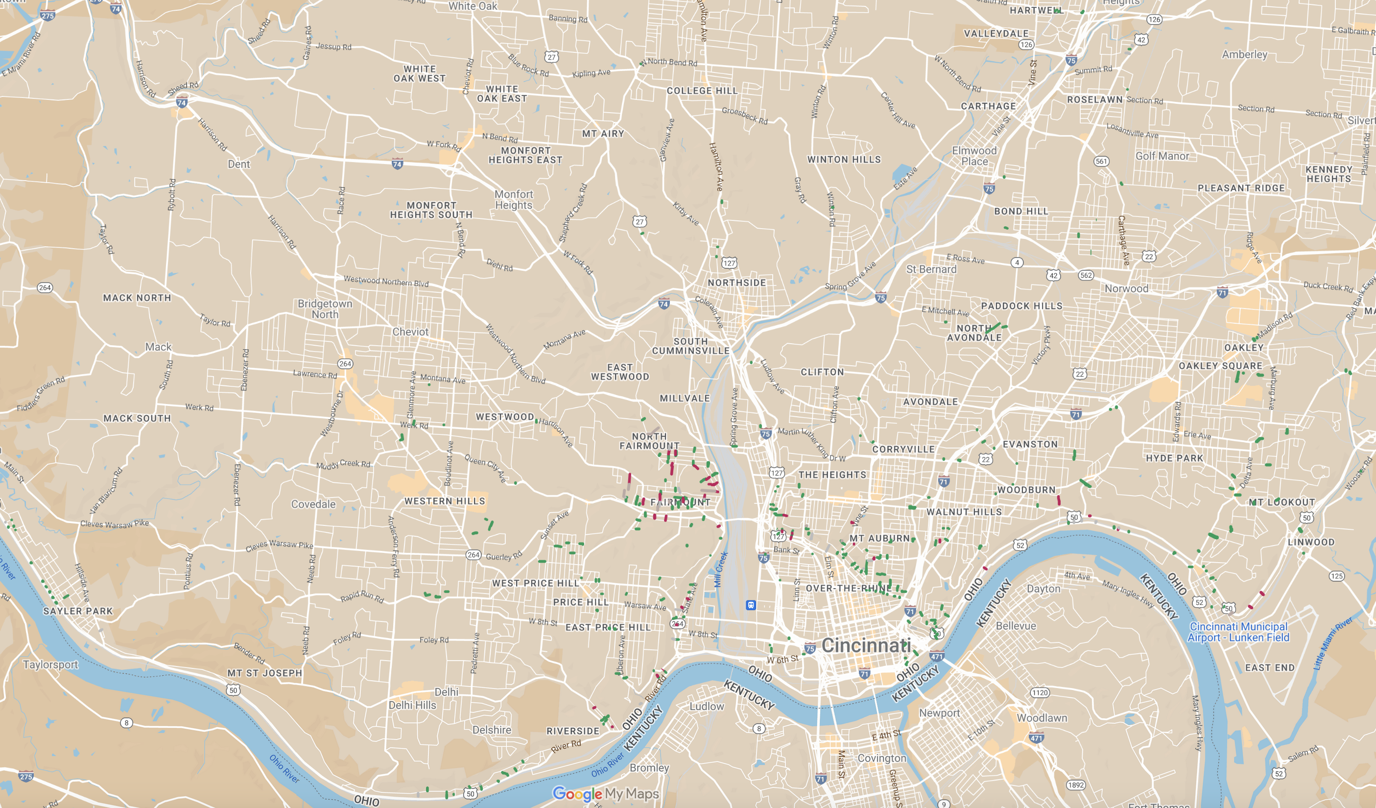 This is a comprehensive inventory of public stairways in Cincinnati, mapped over Winter 2023-24 by Christian Huelsman. After many years of requests for a publicly accessible stairway map, it seemed that the task had to be assigned to self. 384 total stairways and their supplemental data were taken from the City of Cincinnati Department of Transportation and Engineering (DOTE)’s CIty Hillside Stairway Inspection Summary (CHISIS) from 2022. Thanks to American Rescue Plan Act (ARPA) funds, a city maintenance inventory of all public stairways was performed for the first time in a decade. Additionally, numerous repairs to stairways through Cincinnati occurred in 2023, thanks to ARPA funds.